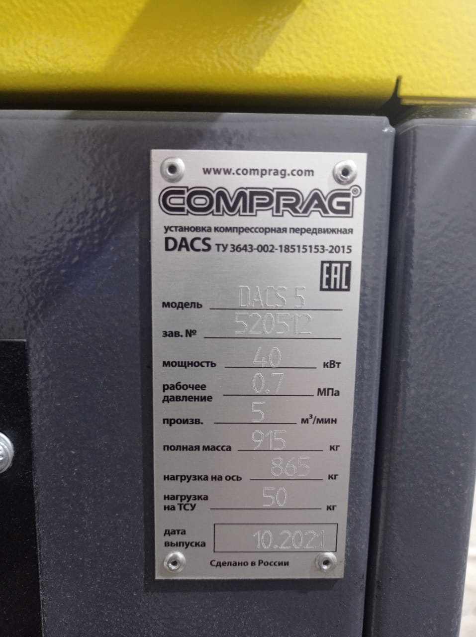 Оборудование: дизельный винтовой компрессор Comprag DACS 5 (на шасси)